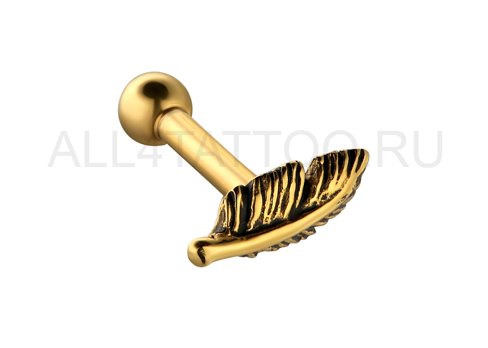 Микроштанга из хирургической стали 316L с золотым покрытием, украшенная пером. Внутренняя резьба.