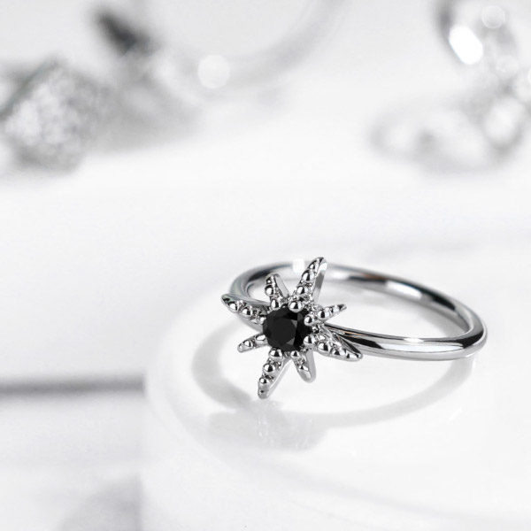 Раздвижное кольцо из родированной латуни в форме звезды с чёрным кристаллом в центре.