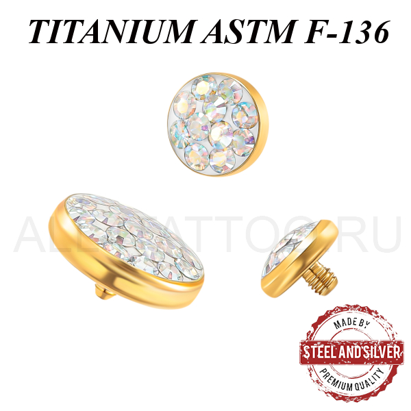 Накрутки из имплантационного титана ASTM F-136 с золотым 24х каратным PVD покрытием, украшенные переливающимися Premium Crystals. Резьба накруток 1,2мм подходят к микродермалам и украшениям толщиной 1,6мм с внутренней резьбой.