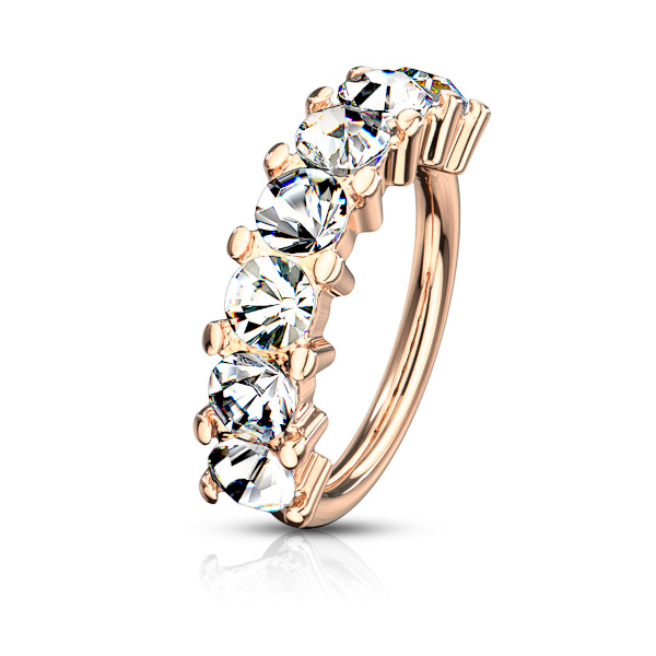 Раздвижное кольцо из хирургической стали 316L с PVD покрытием жёлтого и розового золота украшено прозрачными кристаллами.