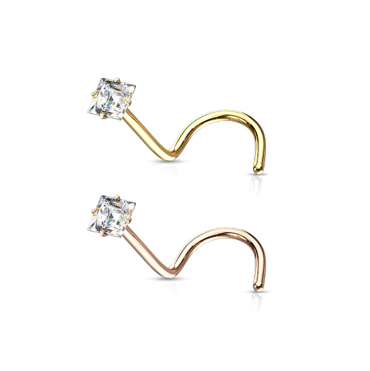 Нострил из хирургической стали 316L с квадратным кристаллом в лапках. Золотое PVD покрытие.