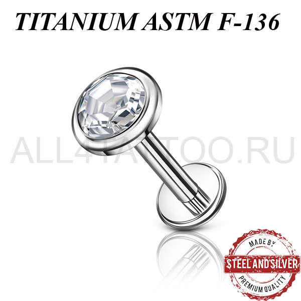 Лабрет из имплантационного титана 6Al-4V-Eli ASTM: F-136 с накруткой украшенной премиальным кристаллом. Внутренняя  резьба.