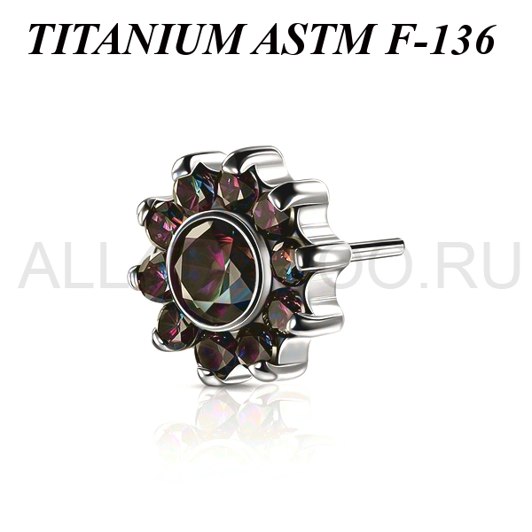 Вставка из имплантационного титана 6Al-4V-Eli ASTM: F-136 для безрезьбовых украшений. Декоративная часть в форме цветка, украшенного фианитами.