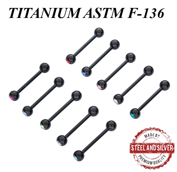 Штанга из имплантационного титана 6Al-4V-Eli ASTM: F-136 с черным PVD покрытием. Украшена кристаллом.