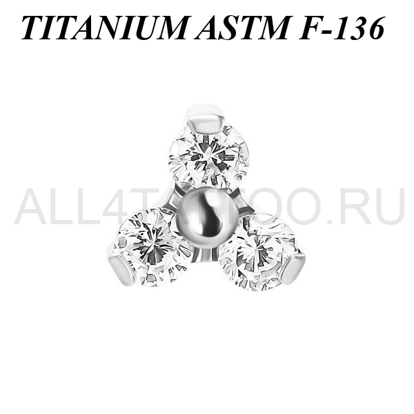 Накрутка из имплантационного титана 6Al-4V-Eli ASTM: F-136 украшена тремя фианитами. Подходит для украшений с внутренней резьбой толщиной 1 и 1,2 мм.