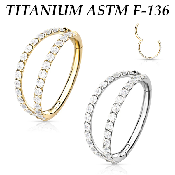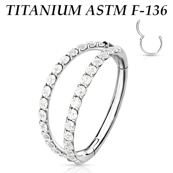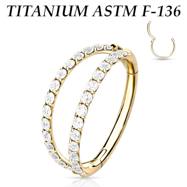 Кликер из имплантационного титана 6Al-4V-Eli ASTM: F-136 с двумя дугами, украшенными миниатюрными прозрачными фианитами. Представлен в двух вариантах: классический титановый и с золотым PVD покрытием.