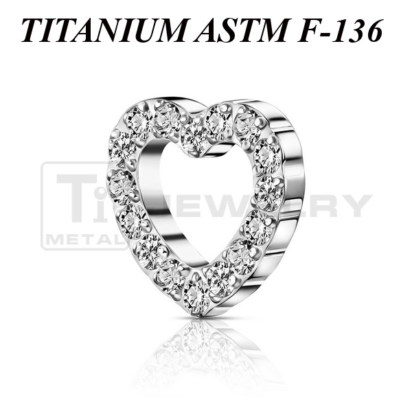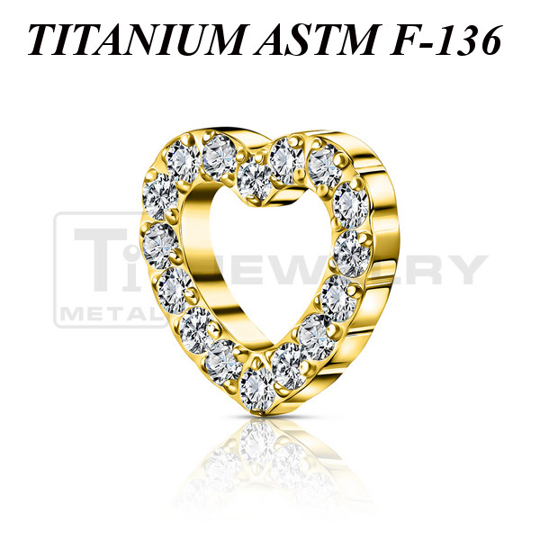 Накрутка из имплантационного титана 6Al-4V-Eli ASTM: F-136 в форме сердца, украшенного прозрачными фианитами. Представлена в двух вариантах: классическая титановая и с золотым PVD покрытием. Размер накрутки: 7х6,5мм. Подходит для украшений с внутренней резьбой толщиной 1 и 1,2 мм.