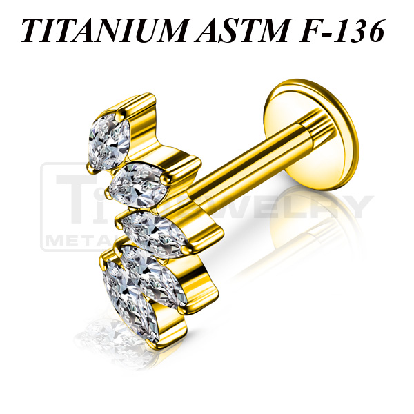Лабрет с внутренней резьбой из имплантационного титана 6Al-4V-Eli ASTM: F-136 с золотым PVD покрытием. Украшен кластером с пятью прозрачными фианитами огранки "маркиз". Размер декоративной части: 12,2х5,8мм.