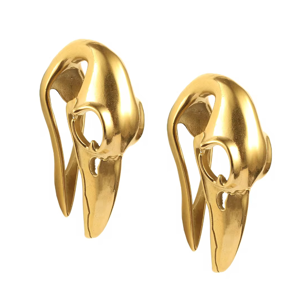 Фигурные подвесы из латуни в форме черепа птицы. Представлены в двух вариантах: родированные и с золотым PVD покрытием.