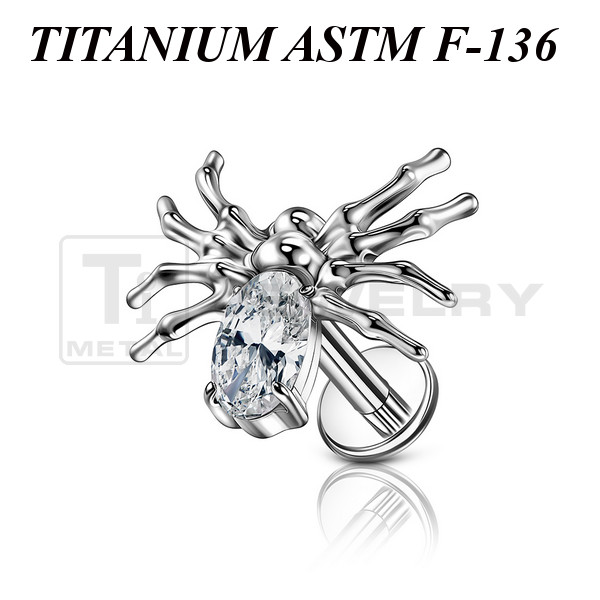 Лабрет с внутренней резьбой из имплантационного титана 6Al-4V-Eli ASTM: F-136 с фигурной накруткой в форме паука, украшенной прозрачным фианитом. Представлен в двух вариантах: классический титановый и с золотым PVD покрытием. Размер накрутки: 10х10,7мм.
