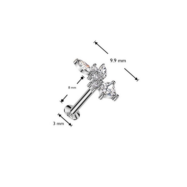 Безрезьбовой лабрет из хирургической стали 316L с декоративной частью из родированной латуни. Украшен фианитами. Представлен в двух вариантах: классический стальной и с золотым PVD покрытием.